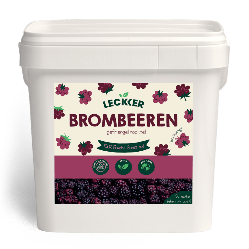 Alle Aspekte von frischen Brombeeren können gefriergetrocknete Brombeeren das ganze Jahr über bieten! Sie sind dazu noch praktisch und wesentlich länger haltbar. Durch den Gefriertrocknungsprozess bleibt der intensive Geschmack vollständig erhalten und verfeinert sich zu einem herben Geschmackserlebnis. Gefriergetrocknete Brombeeren sind der perfekte natürliche Snacks für unterwegs. Ob im Büro, in der Schule oder beim Sport – sie passen in jede Tasche und sind immer griffbereit. Und das Beste: Sie sind ohne Zusatzstoffe und Zucker, also 100% pure Natur!